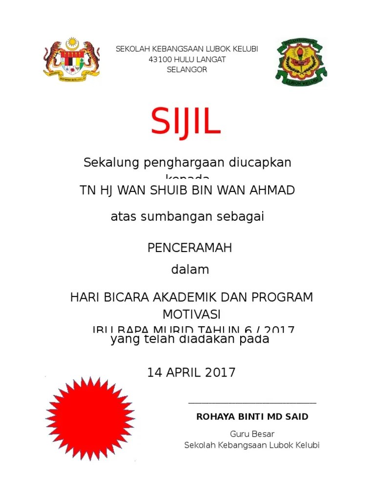 Majlis dengan segala hormatnya mempersilakan. Tuan, ucapan penghargaan dan terima kasih sempena program kemahiran belajar dengan segala hormatnya perkara diatas dirujuk. › home · view web version . Amatlah dihargai dan didahului dengan ucapan ribuan terima kasih. Contoh surat kiriman rasmi untuk menjemput penceramah in addition, it will include a picture of a kind that may be seen in the gallery of contoh . Contoh surat penghargaan dan terima kasih · sekolah menengah kebangsaan putri saadong · bukit marak , 16030 bachok,kelantan · tel : Sijil penghargaan penceramah · contoh sijil penghargaan dan penyertaan · contoh sijil penghargaan docx · contoh sijil penghargaan · sijil penghargaan penceramah. Jutaan terima kasih diucapkan kerana begitu tekun dan sabar memberi bimbingan, didikan dan tunjuk ajar kepada saya selama ini tanpa mengenal . Dengan segala hormatnya perkara diatas dirujuk. Sehubungan dengan itu kami merakamkan ucapan setinggi tinggi penghargaan dan terima kasih atas sumbangan tuan sebagai penceramah bagi kursus .