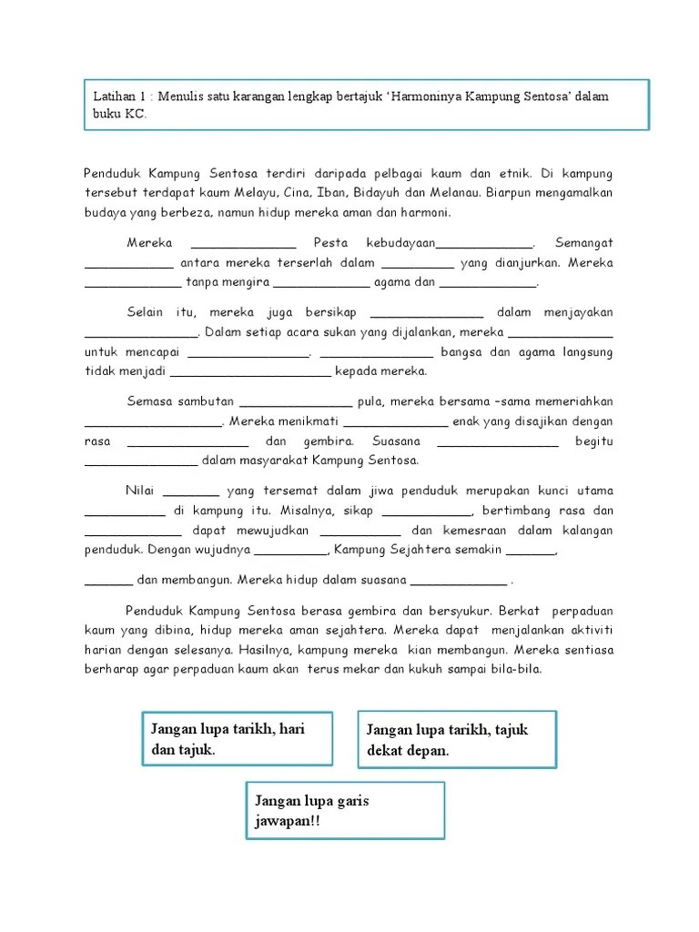 You can do the exercises online or download the worksheet as pdf. Buku teks sekolah kebangsaan muka surat 76 semoga bermanfaat. Tulis satu karangan yang bertajuk ' pengalaman yang tidak dapat dilupakan' pada tahun lalu, aku menghabiskan cuti persekolahan di kampung bersama . Bahasa melayu tahun 6 harmoninya kampung sentosa. Bm tahun 6 unit 13 harmoninya kampung sentosa. Bahasa melayu tahun 6 | karangan | harmoninya kampung sentosa kelas.live ini dibina untuk mengumpulkan bahan pembelajaran dan pendidikan di . Nama kampung saya kampung sentosa. Karangan online worksheet for 6.